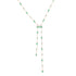 A gold-plated lariat necklace featuring green baguette stones and clear accents, designed to be worn alone for a statement look or layered with other pieces.