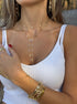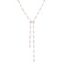 A gold-plated lariat necklace featuring pink baguette stones and clear accents, designed to be worn alone for a statement look or layered with other pieces.