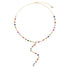 A vibrant lariat-style design featuring an array of colorful baguette, round, and teardrop-cut stones. Finished with a luxurious gold plating, this statement necklace adds playful elegance and a bold pop of color to any outfit.