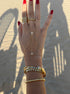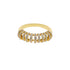 A gold-plated ring with a bold multi-band design, set with rows of sparkling stones. Perfect to wear alone as a statement or stacked with other rings.